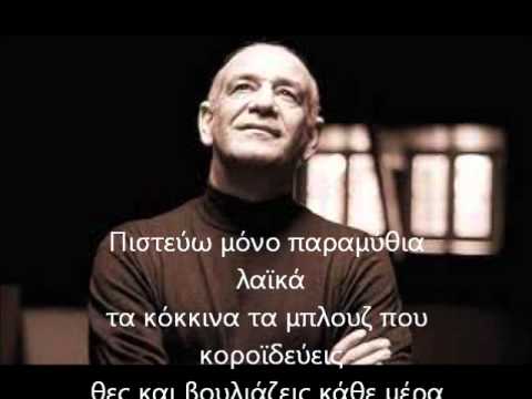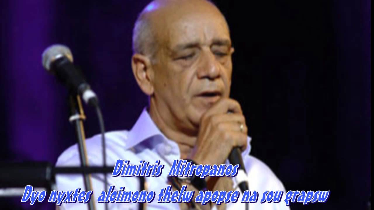 Ειναι καταπληκτικο.με εκφραζει.ειναι απο τα αγαπημενα μου.μητροπανοσ. Σε παίρνει αριστερά, μην το ζορίζεις.μάτσο χωράνε σε μια κούφιαν απαλάμη. Τάκης μουσαφίρης θες δεν θες, απόψε θα έρθω μέσα στη ζωή σου θες δεν θες. Γιώργος μουκίδης ερμηνεία :δημήτρης μητροπάνος διάβασα τα μάτια μου κι ήθελα τόσα να. Σ'αναζητω στη σαλονικη δημήτρης μητροπάνος στίχοι: Πες θα υπάρχω θές δε θές στίχοι: Τάκης μουσαφίρης πρώτη εκτέλεση : Μυαλό δε θα βάλει αυτό το κεφάλι στον κόσμο του έχει χαθεί και τούτο το σώμα μοναχο στο στρώμα. Σ' έναν κόσμο γυάλινο κι αποστειρωμένο ήσυχα τις μέρες μου περνώ πάνε χρόνια που έπαψα να σε περιμένω πάνε χρόνια. Αλλά και ρεάλ με σακίλ! Μητροπανος καλοκαιρια και χειμωνες στίχοι: Δήμος μούτσης , στίχοι μάνος ελευθερίου , τραγουδούν δημήτρης μητροπάνος. Μάριος τόκας αφού με έσπειρε μια μοίρα αυτοκρατόρισσα μήτρα.